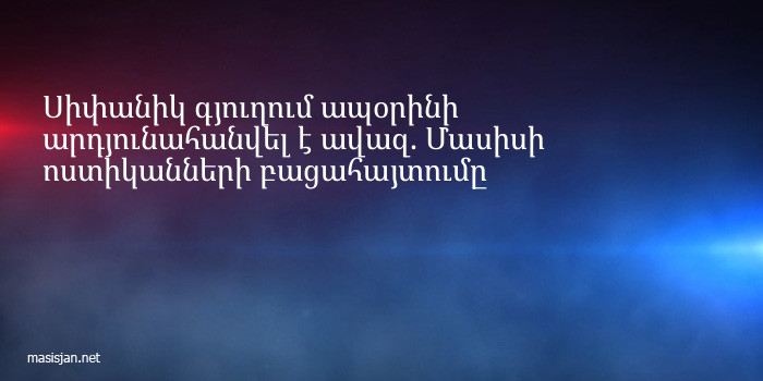 Ոստիկանության Մասիսի բաժնում տեղեկություններ էին ստացվել, որ Մասիս քաղաքի մի բնակիչ Սիփանիկ գյուղում զբաղվում է ավազի ապօրինի արդյունահանմամբ։ Մասիսի ոստիկաններ...